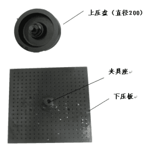 夹具说明:上压盘采用铝合金加工,在保证强度的同时减轻了质量,方便操作者装夹;下压板表面加工有通气孔和通气槽,且直接固定在主机上,同时主机夹具座安装在压板上(可拆), 这样可以避免在更换其他夹具时搬运沉重的下压板,方便试验。