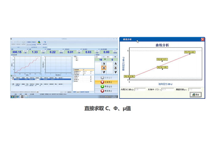3、电脑屏幕显示,即速度、力值、位移等参数均在电脑中显示,实时显示当前法向、切向上的力值,峰值,试验过程信息,当前位移等并在数据库中自动进行分析、计算。试验过程实时记录试验曲线,显示并保存,高速采样;直接求取C、Φ、μ值;