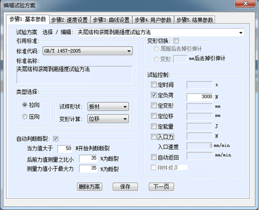 材料测试试验软件可很好的解决滚筒剥离试验对数据采集测控系统的要求。试验软件可根据GB/T 1457-2005 夹层结构滚筒剥离强度试验方案来编辑试验方案,输入试样的相关信息以及根据标准生成测试报告。