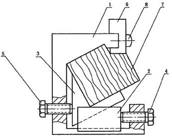 1-夹具主体 2-楔块 3-L形垫块 4、5-螺杆 6-压块 7-试样 8-圆头螺钉