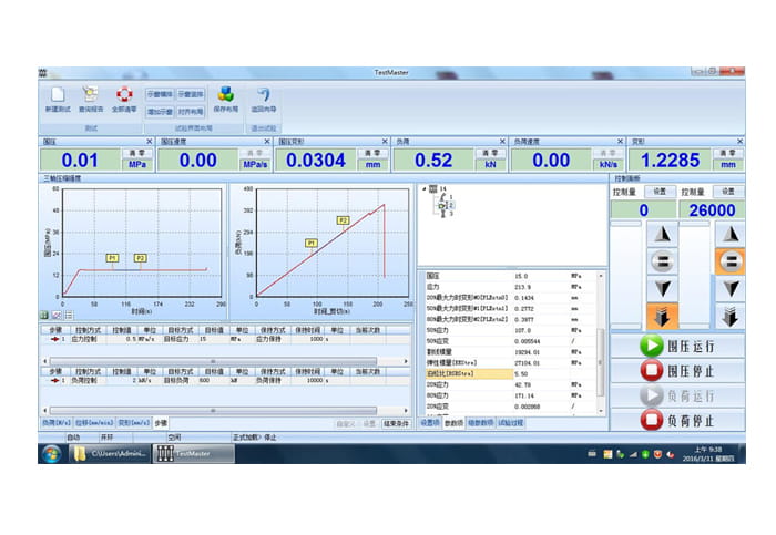 测量控制系统由轴向力传感器、围压传感器、轴向变形传感器、径向变形传感器、位移传感器、全数字式测控器、伺服阀等部分组成。
